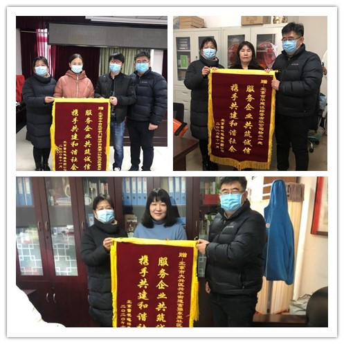 2020年12月15日上午,雪花电器集团公司人力资源部冯部长与公司物业经营部王部长到大兴区兴丰街道富强东里社区居民委员会、北京首华建设经营有限公司物业一处、丰台区右安门街道开阳里第二社区居民委员会分别送去了锦旗,对三家单位在社会化工作开展过程中对本企业的大力协助表示了诚挚的感谢。
